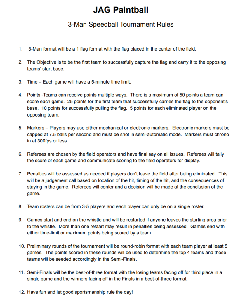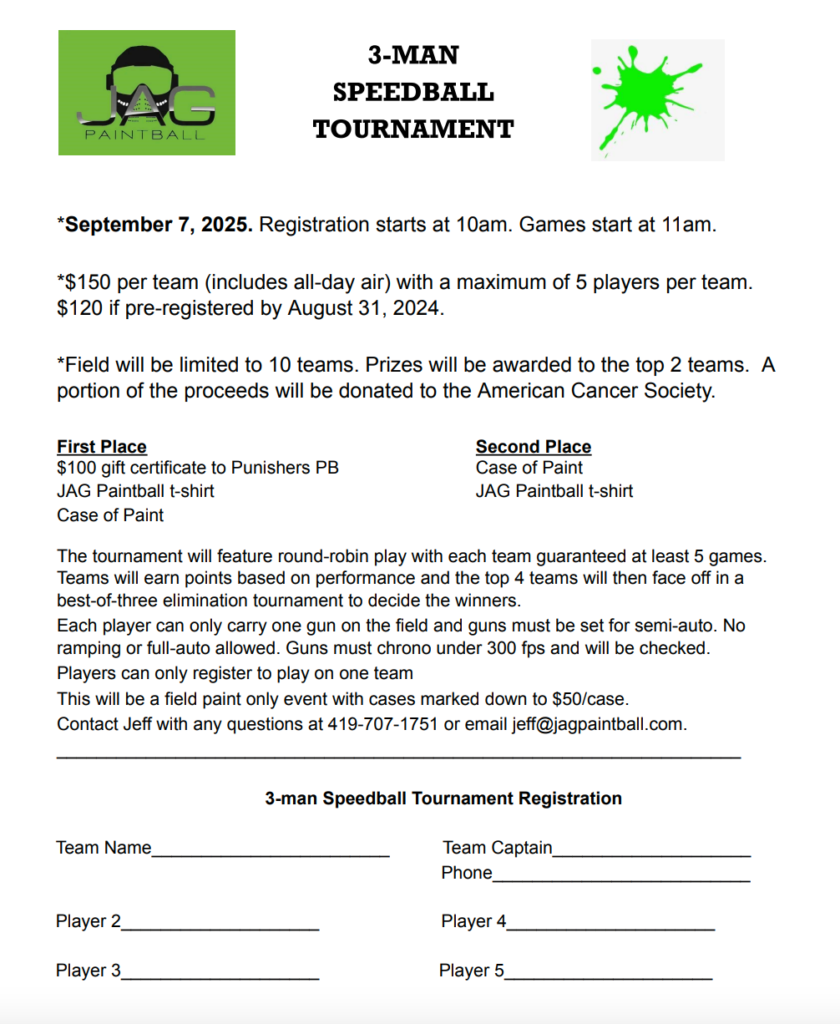 Private Parties are available. The cost is $60/player ($600 minimum) which includes a gun, mask, paint, and all-day air. Book your next Birthday Party, Youth Group outing, or Bachelor Party at JAG Paintball! Available by appointment only.